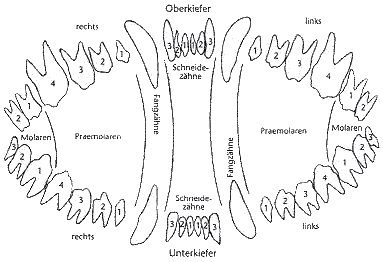 Der Welpe kommt ohne Zähne zur Welt. In der dritten bis vierten Lebenswoche brechen die Milchschneidezähne durch. Mit 6 Wochen ist das Milchgebiss mit insgesamt 28 Zähnen komplett ausgebildet. Der Zahnwechsel beginnt im Alter von ca. vier Monaten und ist im Alter von sieben Monaten abgeschlossen. Das bleibende Gebiss verfügt über 42 Zähne. Der Schäferhund hat ein Scherengebiss, wobei die oberen Schneidezähne scherenartig über die unteren greifen.
